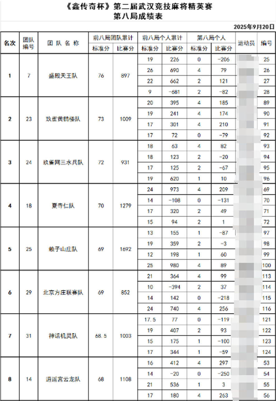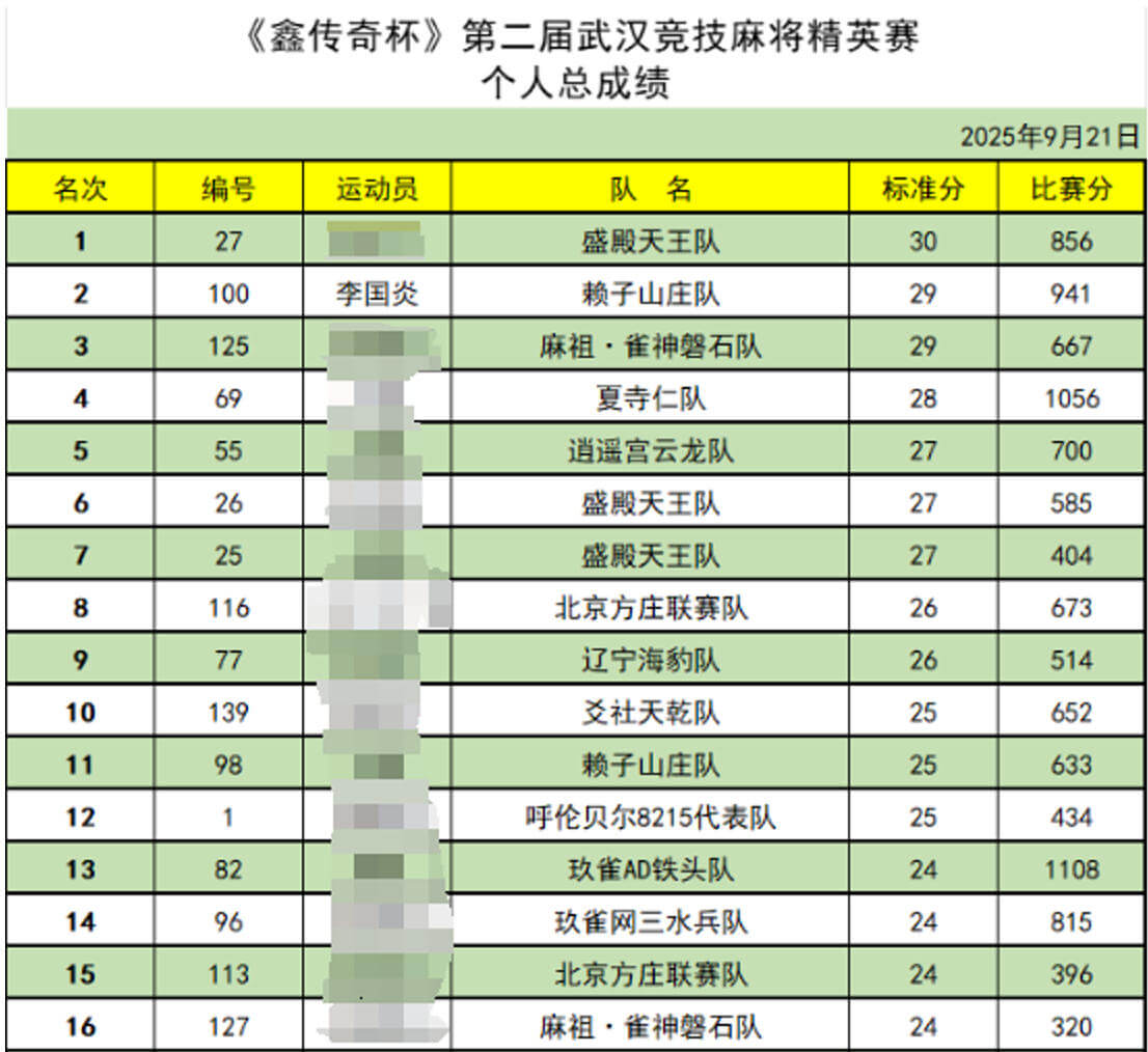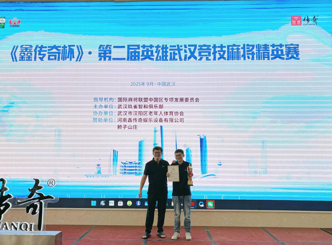由“国际麻将联盟中国区专项发展委员会”指导,“武汉玖雀智和俱乐部”主办,“武汉市汉阳区老年人体育协会”协办,“河南鑫传奇娱乐设备有限公司”承办的“《鑫传奇杯》第二届英雄武汉竞技麻将精英赛”(下简称“鑫传奇杯”)于2025年9月19日至21日在湖北武汉举办。赖子山庄赞助的队伍首次参加《鑫传奇杯》,经过2天8局的激烈对决,赖子山庄代表队夺得团体第五的好成绩,再现辉煌!!!同时,由赖子山庄赞助的玖雀智和俱乐部代表队,获得亚军和季军!赖子山庄队员经过个人后两局的对决,夺得个人第二的好成绩!!!!